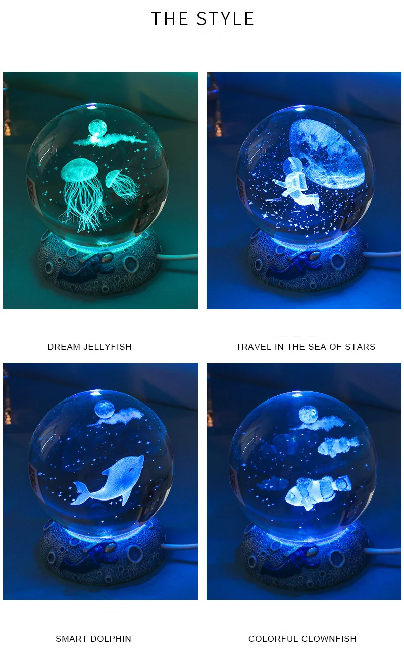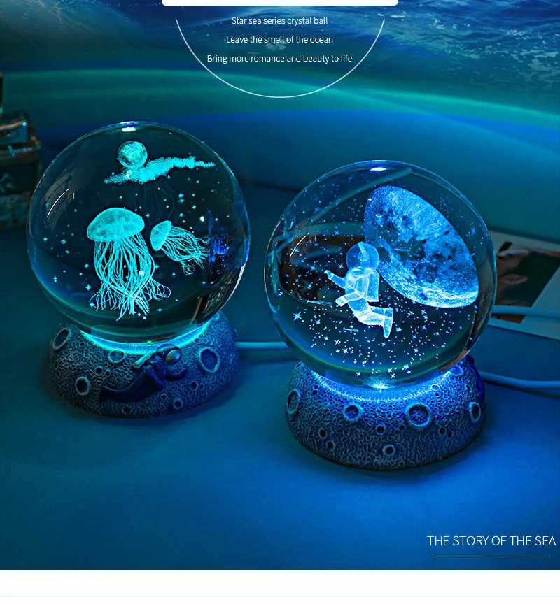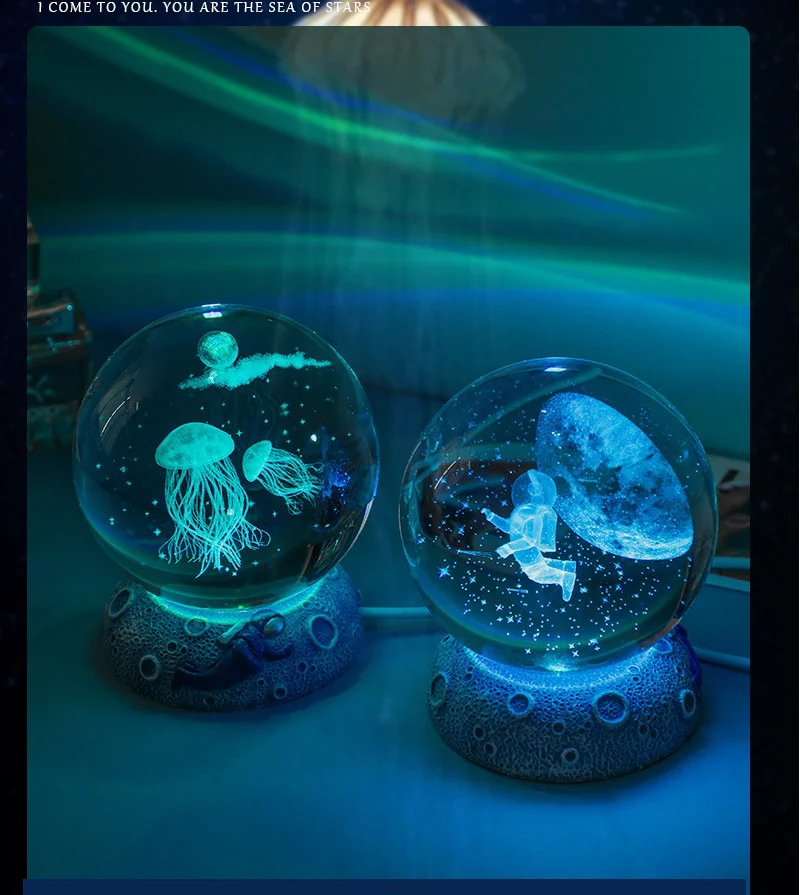 A beautiful addition to any space, this crystal ball night light combines art and ambiance. Its intricate 3D engraving and soft illumination make it an ideal gift and a captivating decor item that enhances any room with warmth and charm.